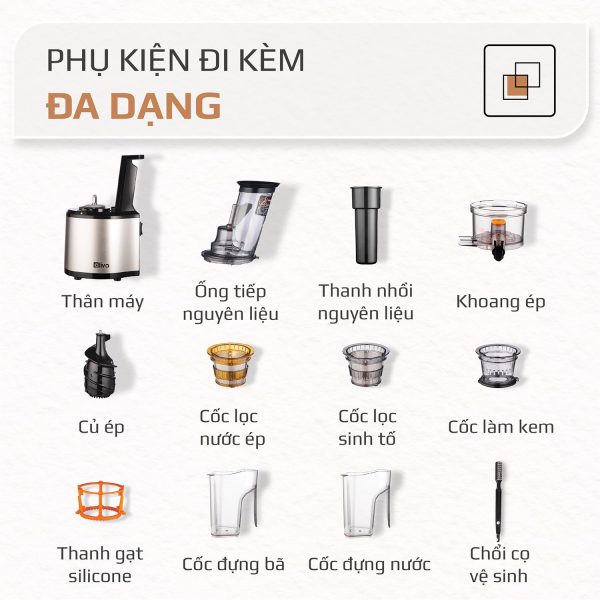 - SJ200 có thể ví như “người hùng thầm lặng” trong gian bếp của bạn với độ ồn tối đa chỉ có 60dB – Top những dòng máy ép êm ái nhất thị trường.