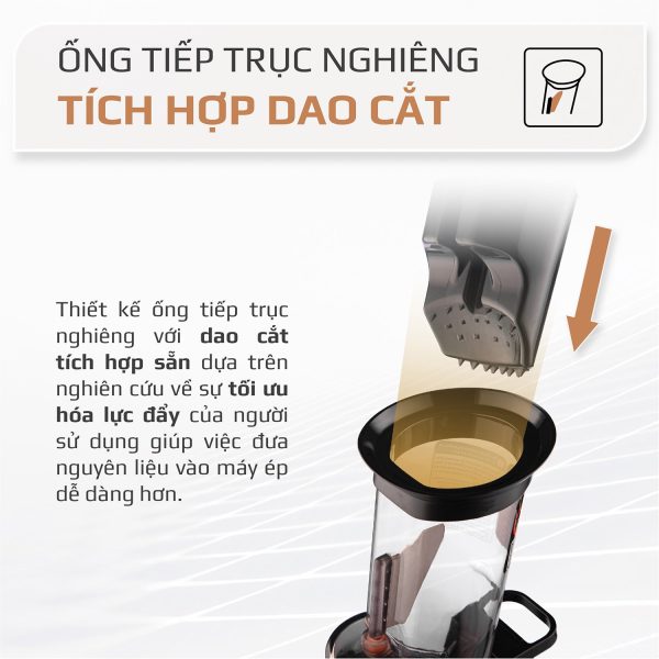 Đặc biệt, thiết kế ống tiếp trục nghiêng với dao cắt tích hợp sẵn dựa trên nghiên cứu về sự tối ưu hóa lực đẩy của người sử dụng giúp việc đưa nguyên liệu vào máy ép dễ dàng hơn.