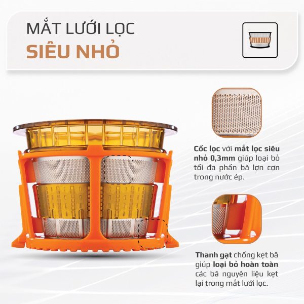 - Cốc lọc nước ép với các mắt lưới siêu nhỏ mang đến những ly nước ép tinh khiết nhất và loại bỏ hoàn toàn cảm giác lợn cợn khi uống