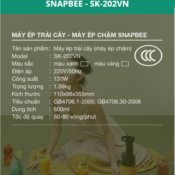 Máy ép chậm SnapBee SK-202VN được thiết kế với 2 tông màu xu hướng hiện đại, kiểu dáng cao cấp hướng đến sự tiện lợi nhất khi sử dụng. (Sản phẩm máy ép chậm SnapBee đạt tiêu chuẩn quốc gia và xuất khẩu đi các nước Đức, Anh, Hàn Quốc )