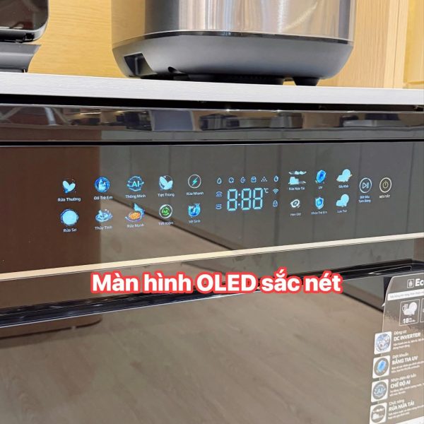 - Màn hình OLED sắc nét, ngay chính giữa là màn hình hiển thị đầy đủ thời gian và trạng thái hoạt động, giúp người dùng dễ dàng theo dõi chương trình rửa đang vận hành một cách thuận tiện và chính xác. Thiết kế tối giản nhưng tinh tế mang đến trải nghiệm sử dụng mượt mà và thân thiện.