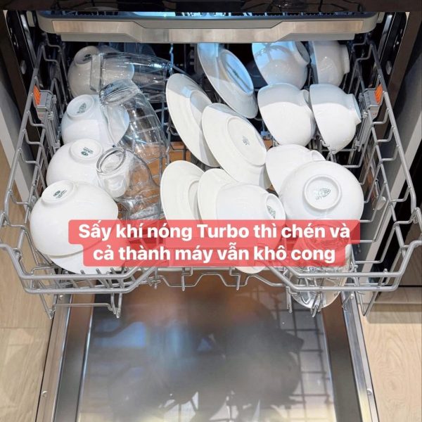 - Sấy khô toàn diện, hiệu quả cao: Luồng khí nóng được thổi đều khắp khoang máy, len lỏi vào mọi ngóc ngách, giúp bát đĩa luôn khô ráo hoàn toàn mà không để lại hơi ẩm.