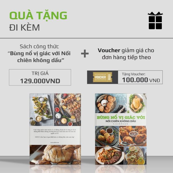 - Xiên quay, Giỏ/lồng quay, Nhông quay, Dụng cụ lấy đồ, Vỉ nướng chống dính: 2 vỉ, Khay hứng đồ/dầu ăn: 1 khay. Tất cả phụ kiện đều được phủ chất liệu CHỐNG DÍNH HOÀN HẢO, dễ vệ sinh và an toàn tuyệt đối khi sử dụng. Khay nướng đi kèm cũng hoạt động như một khay hứng mỡ để hứng lượng mỡ thừa. Khi mua nồi chiên không dầu OLIVO AF 12 bạn sẽ được tặng ngay sách hướng dẫn hàng trăm những món ăn làm từ nồi chiên không dầu viết rất chi tiết và dễ dàng thực hành.