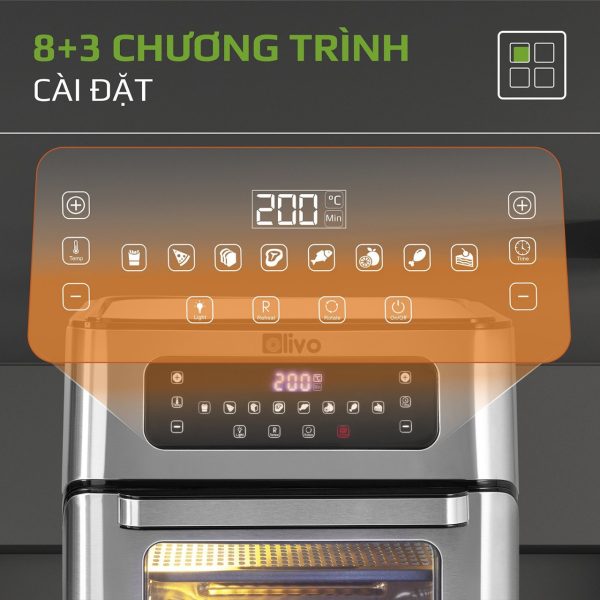 - OLIVO AF12 có tới 8 chương trình nấu ăn được cài đặt sẵn. Với mức nhiệt độ trải dài từ 40ºC đến 200ºC, chiếc nồi chiên không dầu này cho phép bạn Chiên khoai tây, Nướng thịt, Nướng cá, Nướng tôm, Nướng Pizza, Nướng Đùi gà, Nướng bánh, Nướng Gà quay nguyên con, Sấy hoa quả, Rã đông thực phẩm… tất cả đều được tích hợp trong một thiết bị.