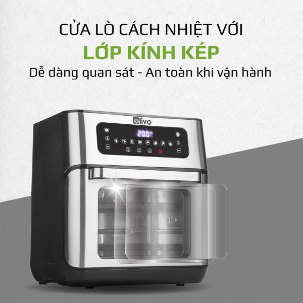 - Nồi chiên không dầu OLIVO AF 12 có đèn bên trong khoang lò, giúp bạn dễ dàng quan sát quá trình quá trình chiên, nướng bên trong bên trong thông qua cửa kính thông minh 2 lớp chịu nhiệt.